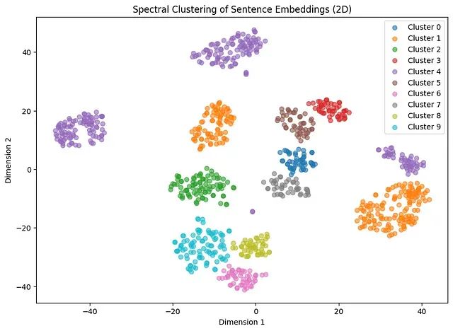 谱聚类的表现相对较差,由于聚类分离度不够理想,其轮廓系数表现不佳。该算法无法为第10号聚类生成有效的标签预测,这表明谱聚类在大多数句子嵌入应用场景中并不适用。