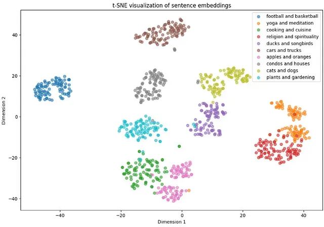 通过可视化分析可以观察到以下特征:各主题类别在空间中形成了清晰的分离边界,每个主题内部的句子呈现紧密的聚集分布,表明主题内部具有较高的相似性。虽然在瑜伽和宗教主题之间存在一定程度的重叠,但总体而言,嵌入向量表现出良好的区分性能力。