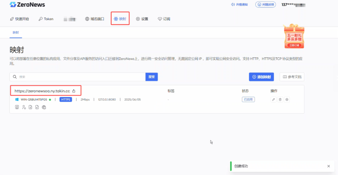 进入 ZeroNews 平台→添加域名端口→添加映射→选择映射类型开始创建即可。