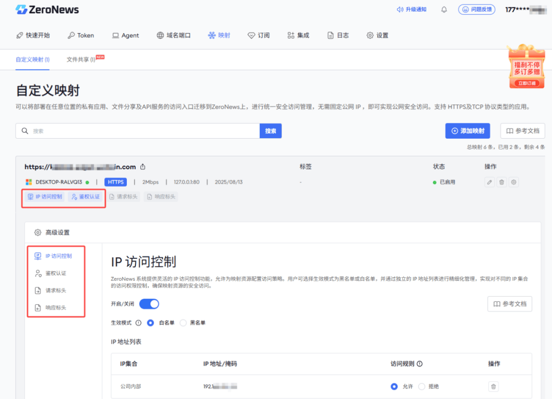 此外,ZeroNews 具备多维智控网关功能,包括IP访问控制、鉴权认证功能,企业可以根据自身安全管理需求,准确设置访问权限,只有满足指定IP或授权账号密码等条件的用户才能远程访问映射的内网办公系统,充分保障了企业的信息安全。
