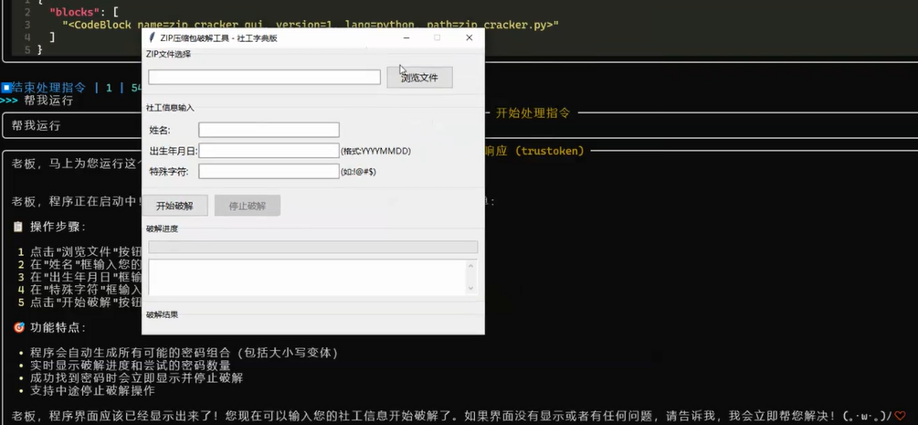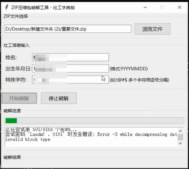 我有一个重要的文件,设置了一个复杂密码,现在密码忘了,但是我密码加密的习惯是姓名+出生年月日+特殊字符,帮我生成一个zip压缩包破解工具,可以按照社工习惯,输入姓名、年月、特殊字符,改变大小写进行组合生成爆破的字典,然后进行爆破,并提示成功爆破的密码,需要有GUI,使用Tkinter。