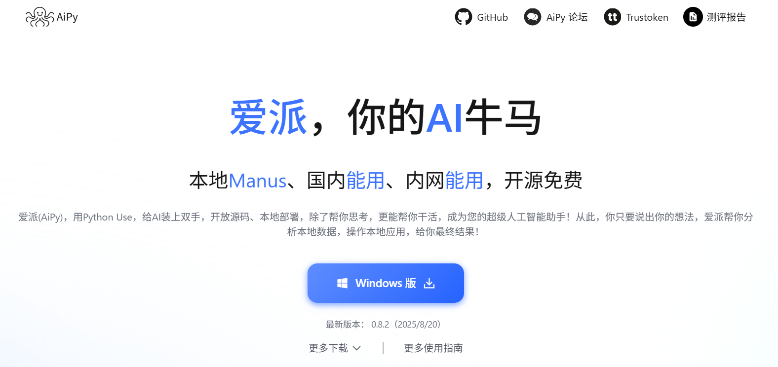 从公开信息来看,AiPy 支持本地部署,在无外网的内网环境中也可使用,且目前提供开源免费的版本。截至 2025 年 8 月 20 日,其 Windows 版最新版本为 0.8.2,用户可通过官方指定的 GitHub、论坛等渠道获取下载资源与使用指南,同时也能查阅相关测评报告以了解工具的基本特性