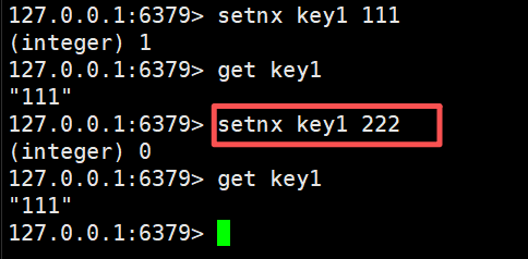 SETNX 不存在才能设置,存在则设置失败被框出来的这个命令没有生效,因为key1的值是没有改变的