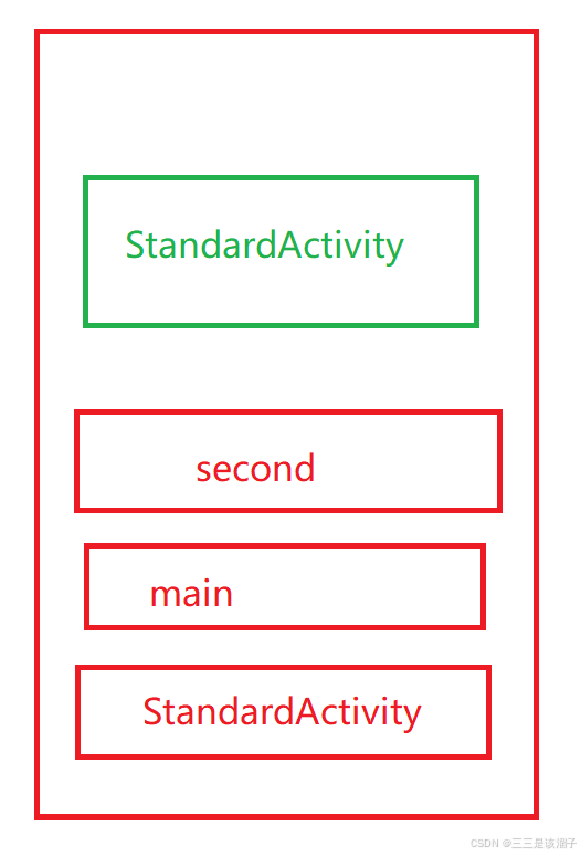 second跳转到StandardActivity,尽管栈中已经存在StandardActivity,但它并不在栈顶,所以重新创建一个新的实例,放置栈顶