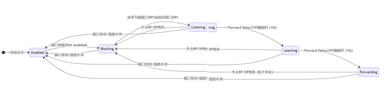 在网络交换领域,生成树协议(Spanning Tree Protocol, STP)是防止二层环路的基石技术。理解其端口状态迁移过程,是掌握STP的关键。本文将基于一张常见的状态迁移示意图,深入剖析STP端口状态的完整生命周期。