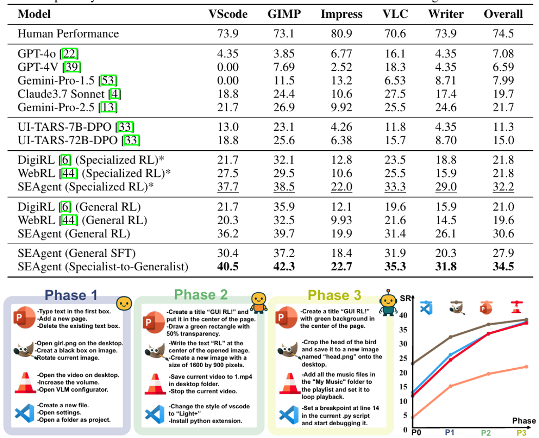 这套核心算法被置于一个更大的系统框架中,由 课程生成器 提供循序渐进的任务,并通过 「从专家到通才」 的策略,将多个单一软件的 「专家」能力融合成一个更强大的 「通才」 模型。最终,SEAgent 在 OSWorld 基准测试中取得了显著的性能飞跃,将基线模型的成功率大幅提升,充分验证了其算法框架的先进性与有效性。
