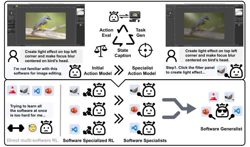在单个智能体的进化之上,我们探索了如何构建一个能操作多种软件的 「通才」 模型。我们发现,直接在多软件环境中训练一个 「通才」,效果并不理想,其性能甚至不如在单一软件上训练的 「专才」 模型 。