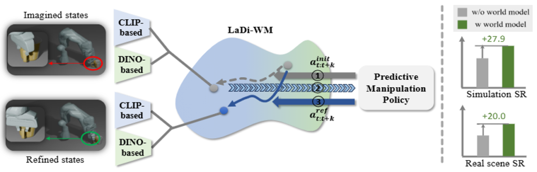 在真实场景中,LaDi-WM 将原始模仿学习策略的成功率显著提升 20%(表 4)。