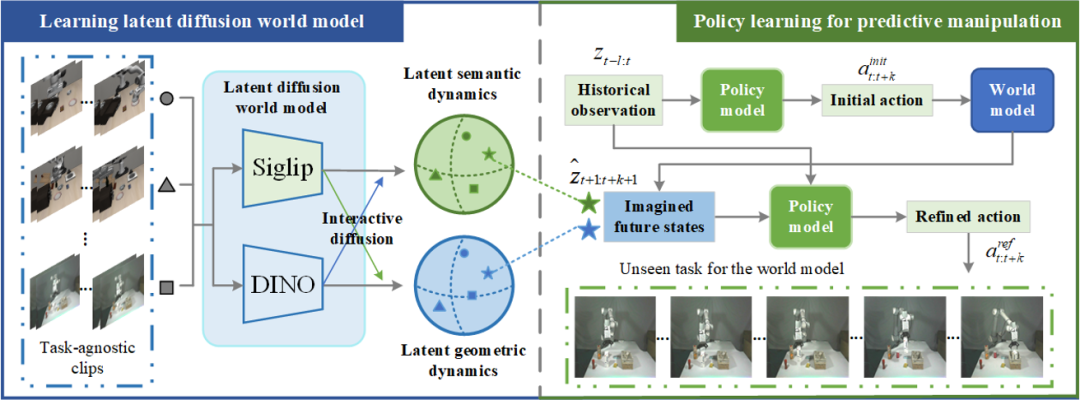 图 1 :(左)通过任务无关的片段学习隐扩散世界模型;(右)通过世界模型的未来状态预测来优化策略模型