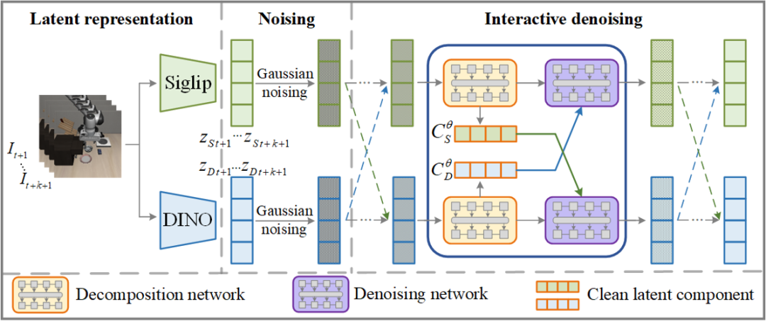 (a) 隐空间表示:通过预训练的视觉基础模型对观测图像提取几何表征与语义表征,其中几何表征利用 DINOv2 提取,而语义表征则使用 Siglip 提取。
