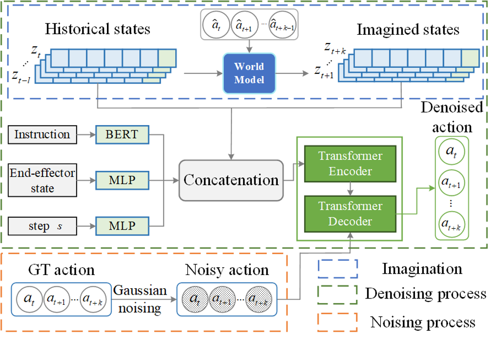 (a) 结合世界模型的未来预测引导策略学习:将世界模型给出的未来预测作为额外的输入,引导策略模型的准确动作预测;模型架构基于扩散策略模型,有利于学习多模态动作分布。
