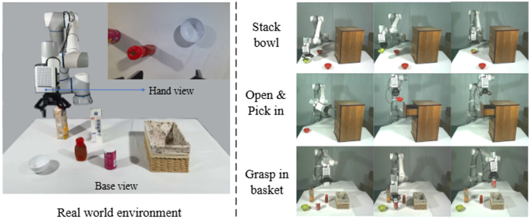 团队也在真实场景中验证了所提出框架的性能,具体操作任务包括「叠碗」、「开抽屉」、「关抽屉」以及「抓取物体放入篮子」等,如图 6 所示。