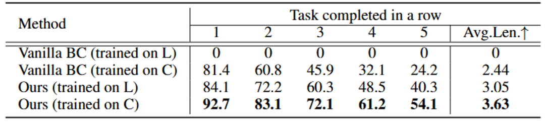表 3: 跨场景实验结果。L 代表 LIBERO-LONG,C 代表 CALVIN D-D