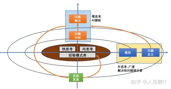 而对于个体的思考重心则是由内思考沿着X轴朝外扩展,核心就是知识的广度的扩展,包括对于问题定义域和问题解决域的分离。个体的重心应该放在外界场景和问题的感知上面,放在对问题的精确定义上面。在问题定义清楚后又转入到了实际问题的深入思考和解决,即我前面谈到的可以更多的通过AI辅助来完成。