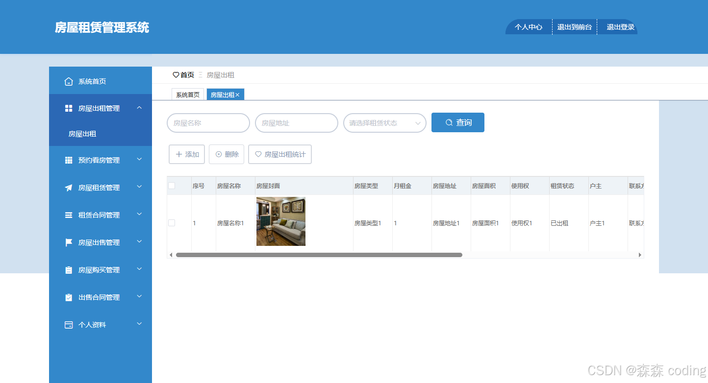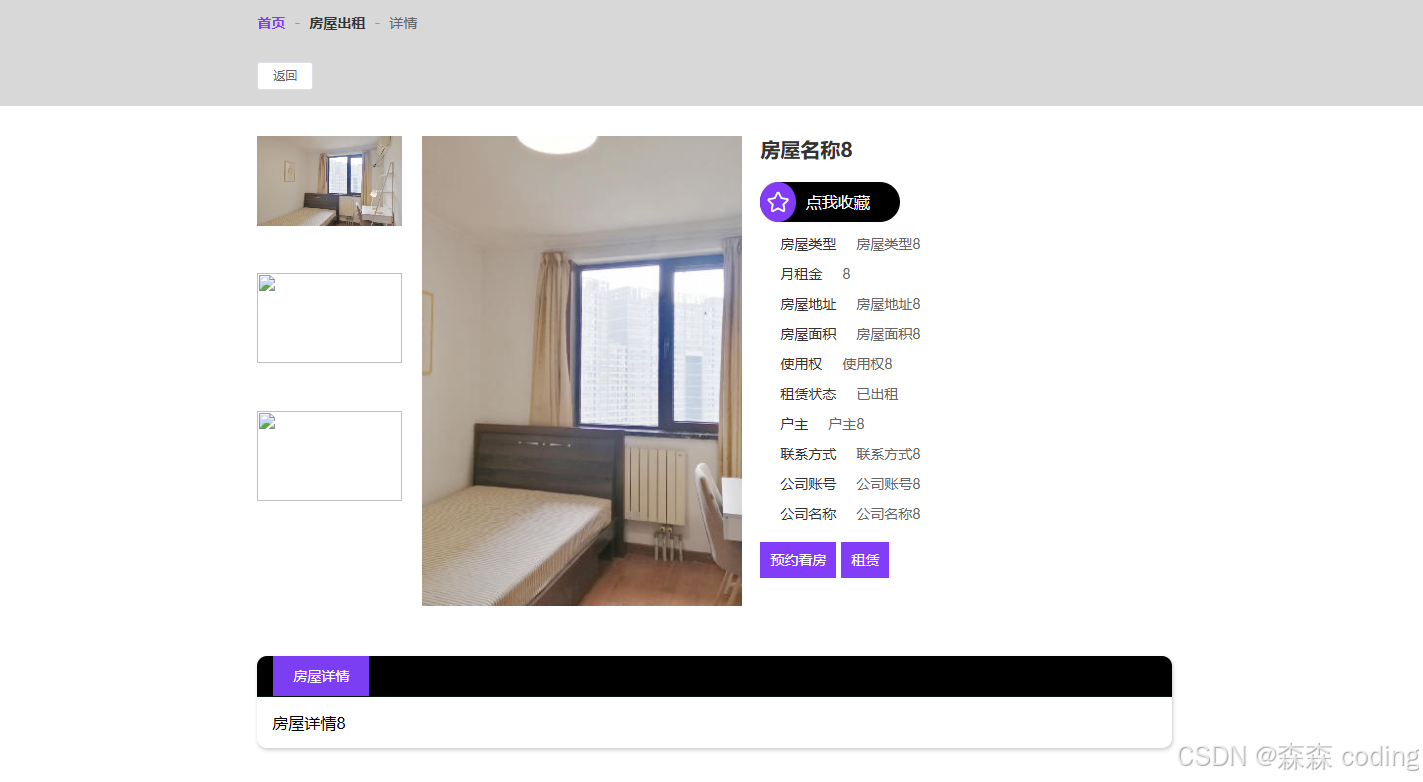 房屋租赁管理系统包括用户、地产公司、管理员3个模块 ⭐️用户功能:主要包括房屋信息浏览、预约看房、在线租赁、在线购房、合同管理、购房常识浏览、个人信息管理等 ⭐️地产公司功能:主要包括房屋出售管理、预约看房管理、房屋租赁管理、房屋出售管理、合同管理、个人信息管理等 ⭐️管理员功能:主要包括数据统计、用户管理、地产公司管理、房屋出售管理、预约看房管理、房屋租赁管理、房屋出售管理、合同管理、购房常识管理等