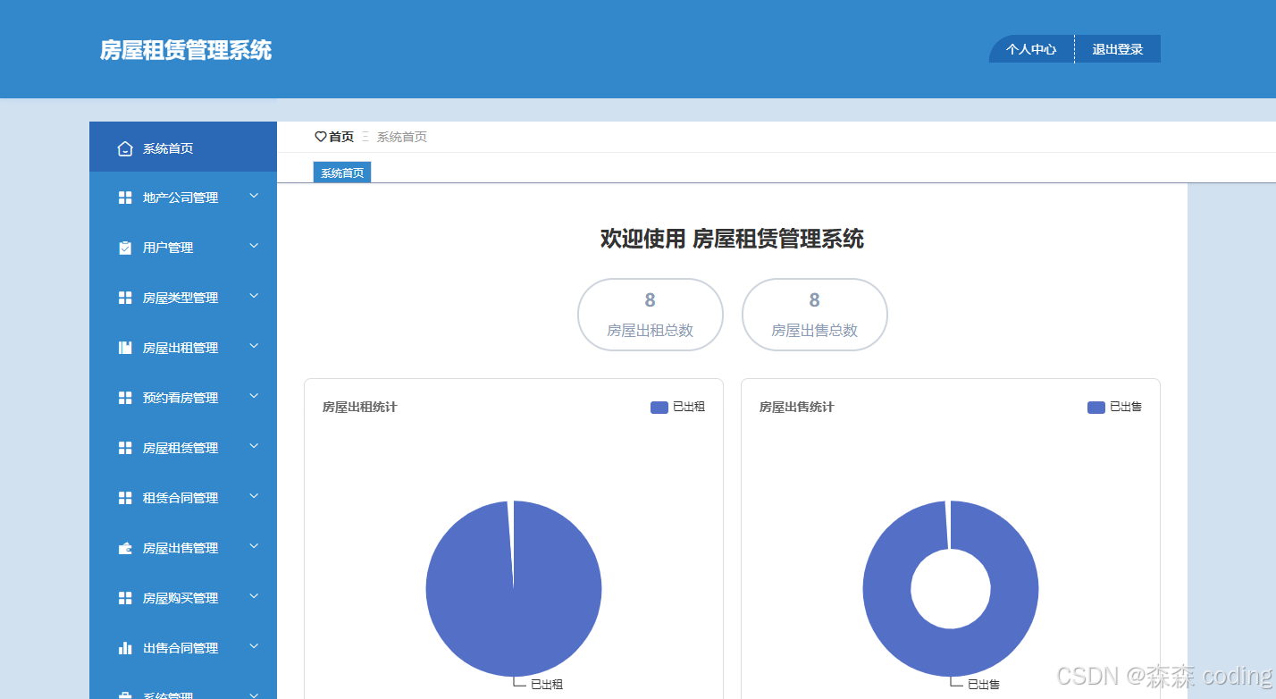 本系统为实现在线预约看房以及房屋的租赁及购买的需求,而打造的“房屋租赁管理系统”,房屋租赁管理系统是一个工作量丰富,实用性极强的选题,所以如果没有特殊要求 房屋租赁管理系统是一个不错的选择,本房屋租赁管理系统功能涵盖了数据统计、用户管理、地产公司管理、房屋出售管理、预约看房管理、房屋租赁管理、房屋出售管理、合同管理、购房常识管理等