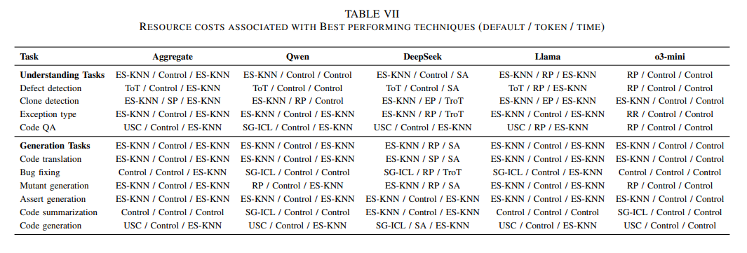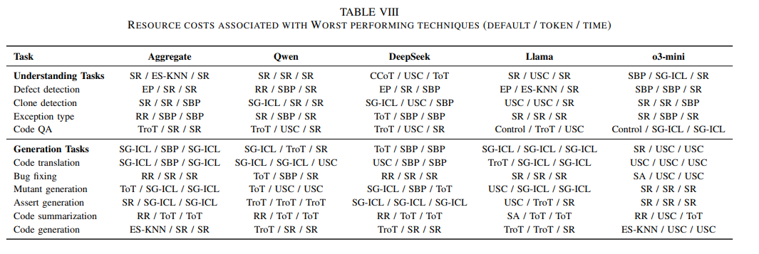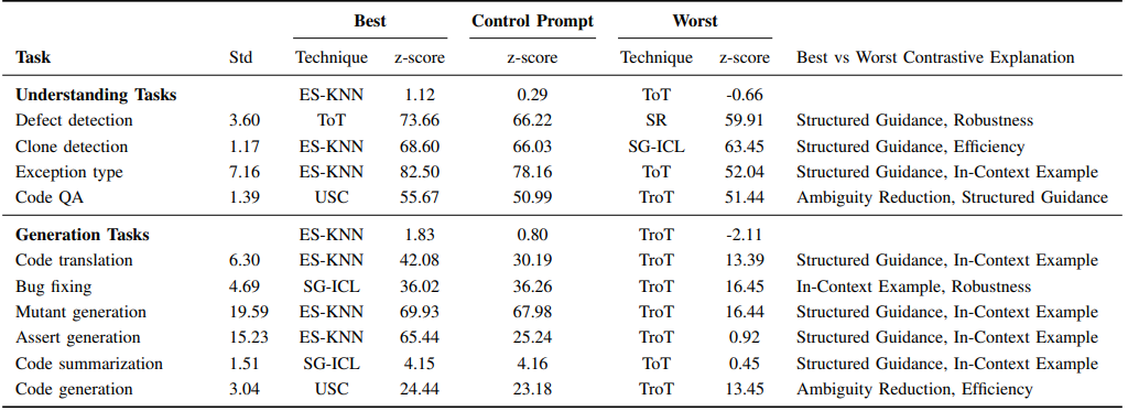 基于在10个软件工程任务上的综合表现,提示技术的总体排名如下: