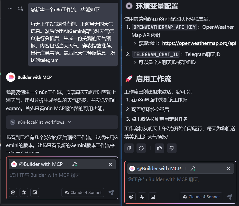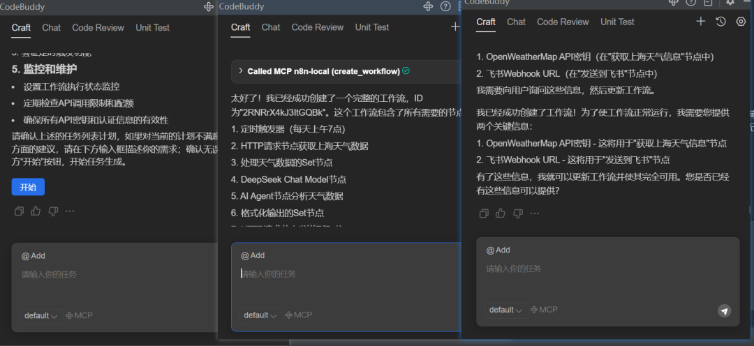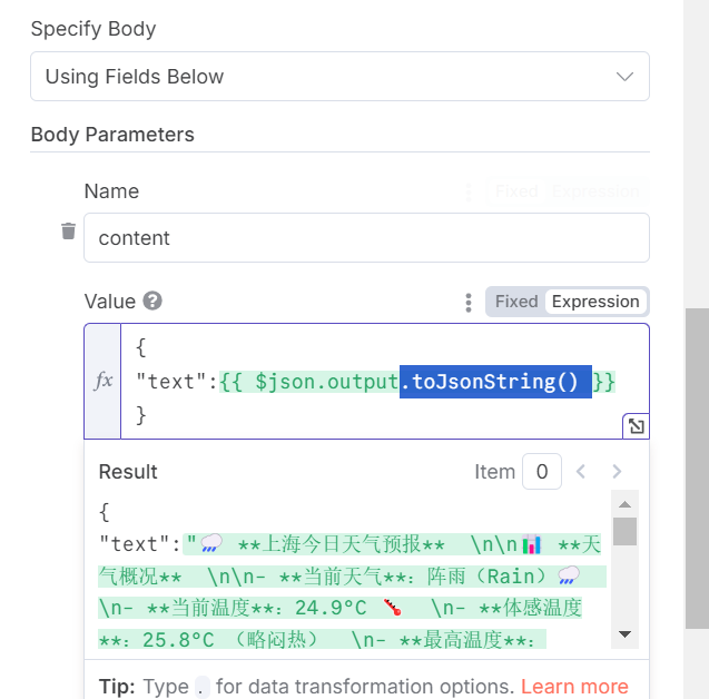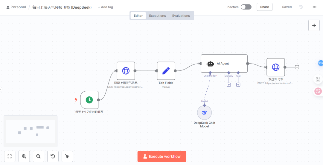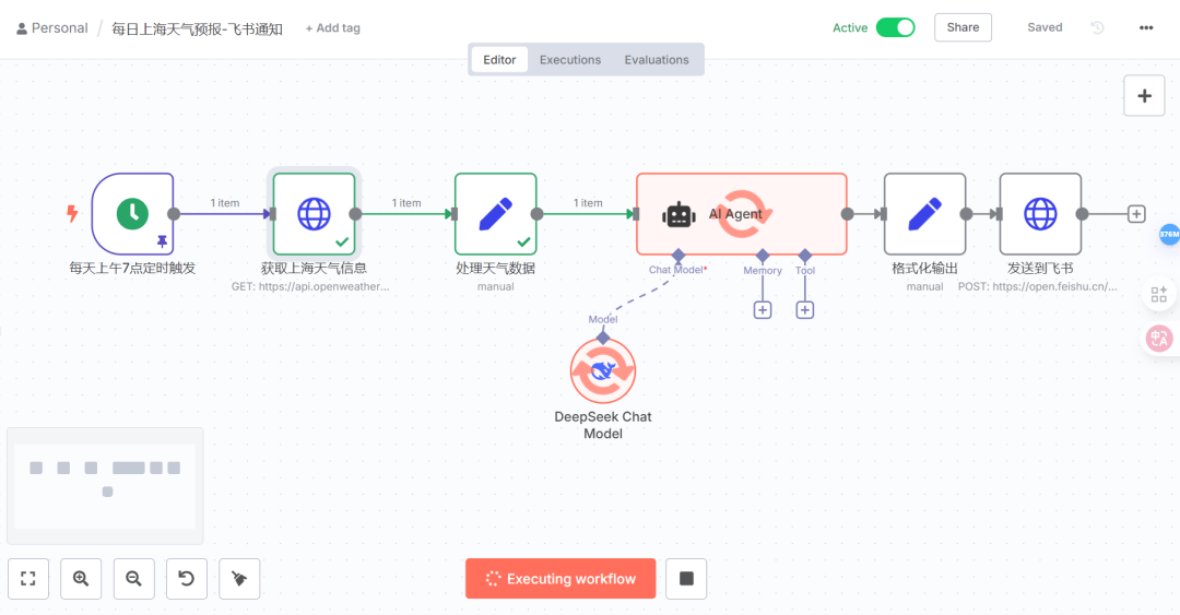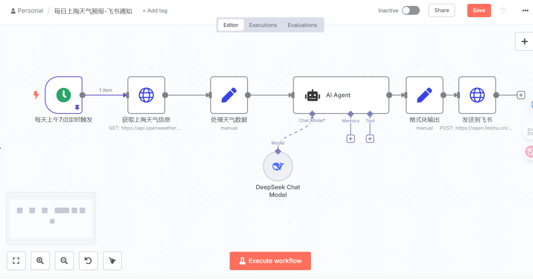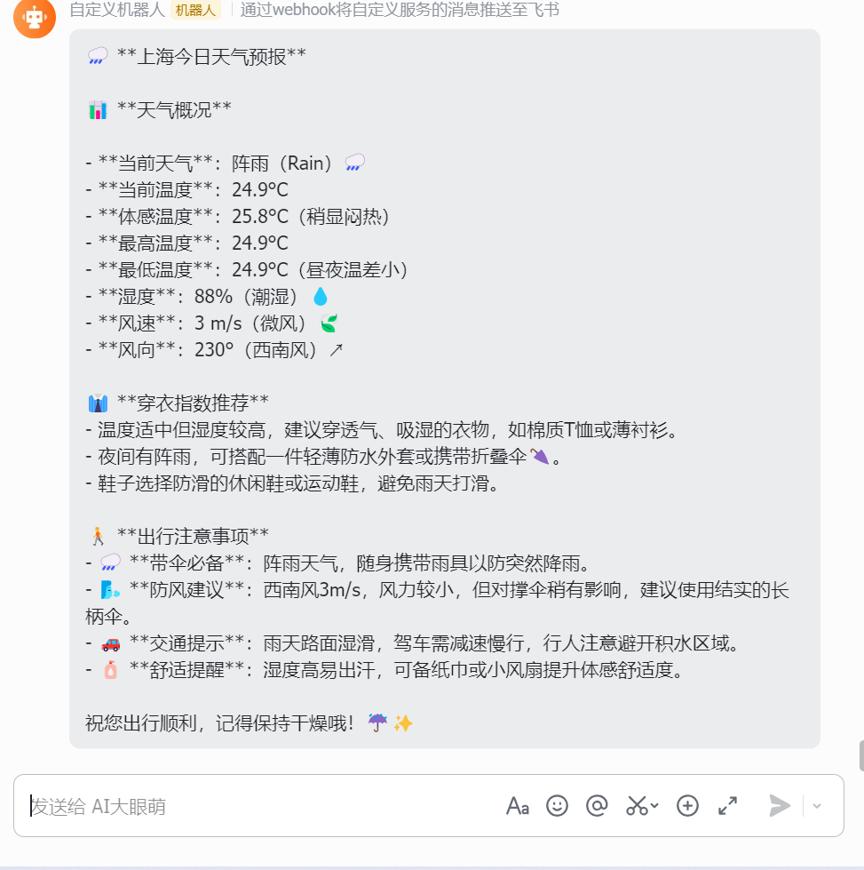 每天上午7点定时查询,上海当天的天气信息。然后使用AI(Deepseek模型)对天气信息进行分析后,生成一份美观的天气预报,内容包括当天天气,穿衣指数推荐、出行注意事项。最后把天气预报信息,发送到飞书。