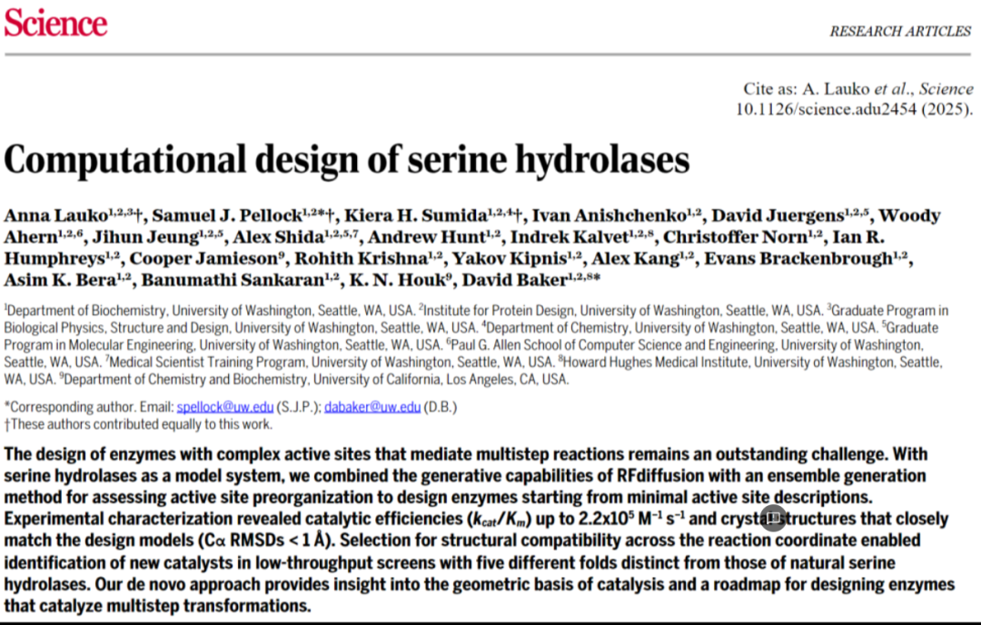 类似突破也出现在酶设计领域。2025年2月,华盛顿大学David Baker团队在《Science》发表论文,首次通过AI设计出具有全新折叠类型的高效丝氨酸水解酶。其催化效率(kcat/Km ~10⁵ M⁻¹s⁻¹)较此前提升2-5个数量级,接近天然酶水平。
