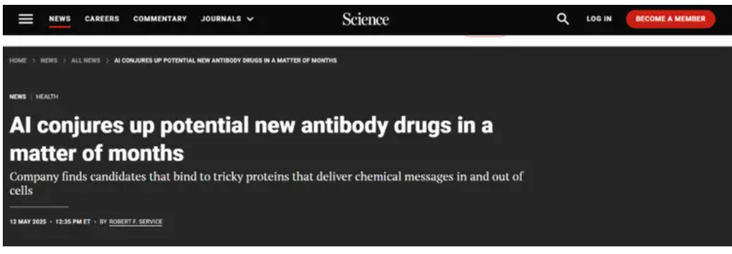 2025年5月,《Science》杂志报道了一项震惊医学界的成果:美国斯坦福大学团队开发的AI系统在 短短3个月内 ,设计出数十种靶向G蛋白偶联受体(GPCR)的候选抗体,其中两个抗体展现出罕见的受体激活能力——这是全球首个CXCR7抗体激动剂,为癌症、艾滋病等疾病治疗开辟了新途径。