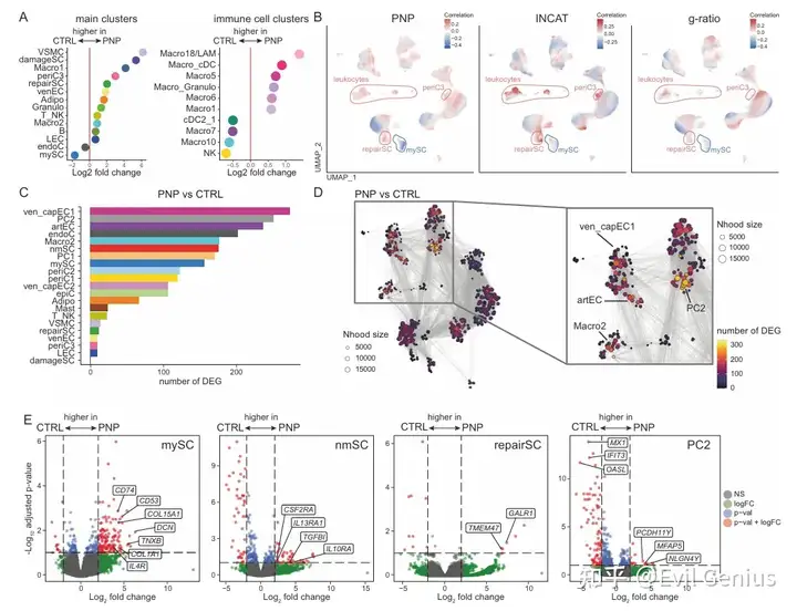 通过snRNA-seq数据系统分析了PNP对周围神经的影响。最显著的变化是髓鞘形成施万细胞(mySC)的减少及损伤型(damageSC)与修复型施万细胞(repairSC)的出现。
