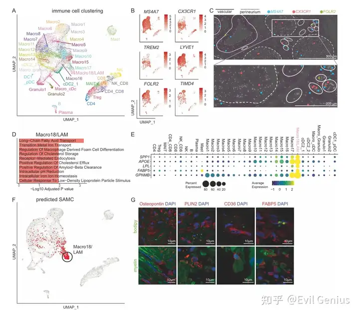值得注意的是,一个暂定为神经内膜的巨噬细胞簇(Macro18)显著富集脂质代谢相关通路。该簇高表达SPP1、APOE、LPL、FABP5和GPNMB,呈现与脂质相关巨噬细胞(LAMs)及既往报道的中风中枢神经系统髓系细胞相似的吞噬和脂质感应表型。将该中风相关髓系细胞(SAMC)数据集投射至本研究数据后,发现其主要与Macro18 cluster对齐。组织学分析显示,Macro18标志物(SPP1/骨桥蛋白、PLIN2、CD36、FABP5)与PNP患者样本中的髓鞘结构及中性脂质荧光标记(BODIPY)共定位。这表明Macro18很可能代表具有髓鞘吞噬能力的细胞群体,其功能类似于清除髓鞘碎片的中风相关髓系细胞。由此可见,中枢与周围神经系统在脂质过量情况下可能共享类似的损伤应答机制。