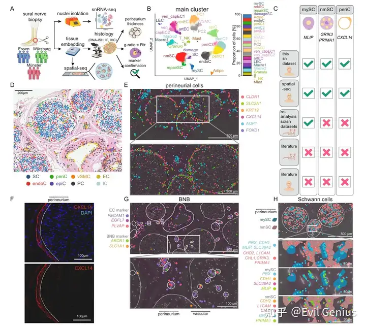 研究发现并验证了多个新型细胞类型特异性标志物:髓鞘形成施万细胞表达MLIP,非髓鞘形成施万细胞表达GRIK3和PRIMA1,神经束膜细胞表达CXCL14。空间转录组分析证实这些标志物与已知标记基因共定位,其中CXCL14-CXCR4信号轴可能介导神经束膜细胞与免疫细胞的相互作用。研究还发现啮齿类与人类之间存在部分基因表达差异,但通过多模态技术验证了这些标志物在跨物种中的保守性。