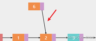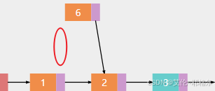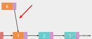 b.让被删除的节点6的前一个节点1,让节点1指向节点2,这里有一个细节是,删除时,你要知道你的前一个节点的位置和后一个节点的位置,在这就是,删除节点6,要知道节点1、2的位置。若是删除最后一个节点,只需让它的前一个节点的next指向null就好