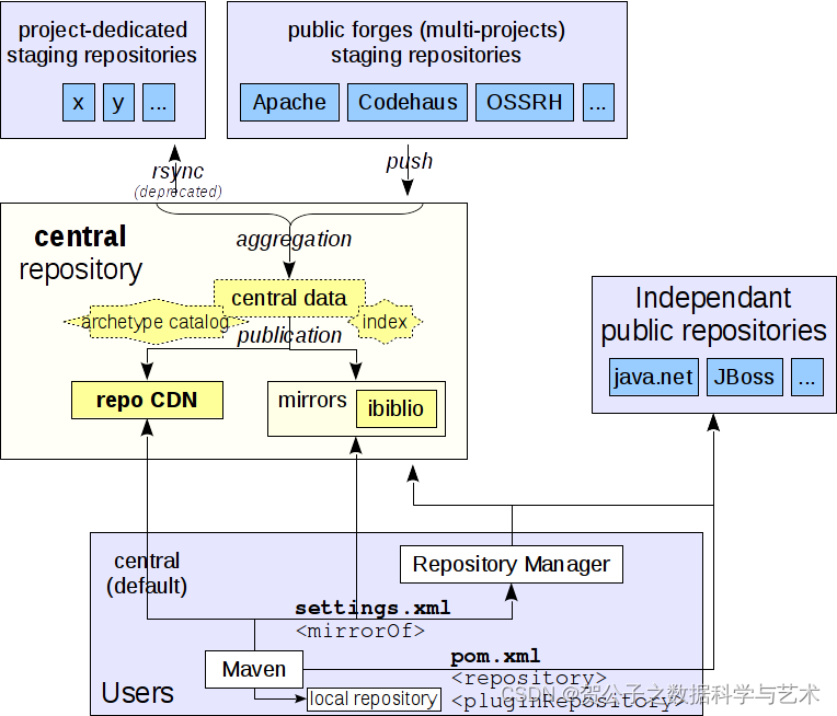 其中md5, sha1校验文件是用来保证这个meta文件的完整性。 maven在编绎项目时,会先尝试请求maven-metadata.xml,如果没有找到,则会直接尝试请求到jar文件,在下载jar文件时也会尝试下载jar的md5, sha1文件。 maven-metadata.xml文件很重要,如果没有这个文件来指明最新的jar版本,那么即使远程仓库里的jar更新了版本,本地maven编绎时用上-U参数,也不会拉取到最新的jar! 所以并不能简单地把jar包放到github上就完事了,一定要先在本地Deploy,生成maven-metadata.xml文件,并上传到github上。 参考:http://maven.apache.org/ref/3.2.2/maven-repository-metadata/repository-metadata.html maven的仓库关系 https://maven.apache.org/repository/index.html