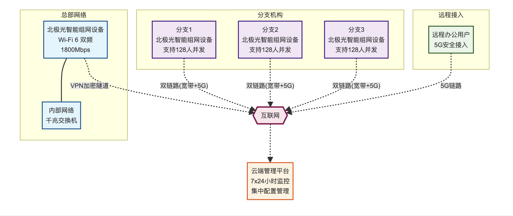 项目采用分布式智能组网架构,结合云端管理平台,实现总部、分支机构和远程办公的高效互联。