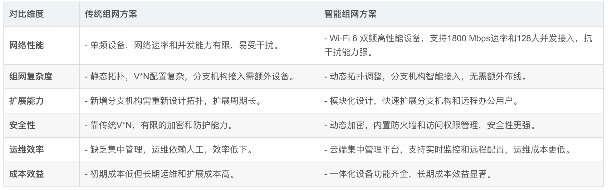 通过智能组网设备和创新技术,彻底突破了传统组网方案的性能和灵活性瓶颈,为企业提供了更高效、更安全、更具扩展性的网络基础设施。