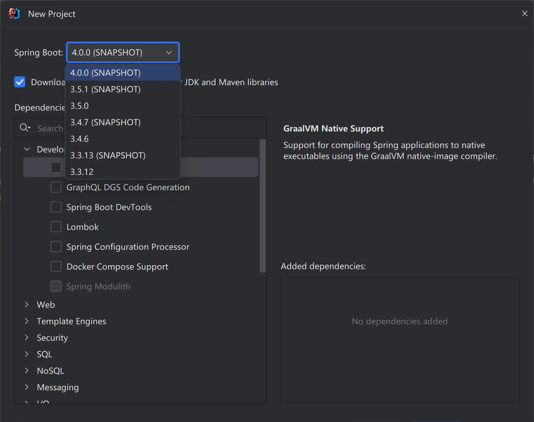 当我们创建一个新的Spring Boot项目时,现在有了Spring Boot 4.0.0相关的选项: