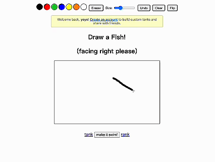 打开网站,你会看到一个简单的绘图工具,可以选择颜色和笔刷粗细,然后在画布上绘制一条面朝右侧的小鱼,AI 就会实时判断你的作品是否像鱼,并通过画布背景颜色的变化给予即时反馈。