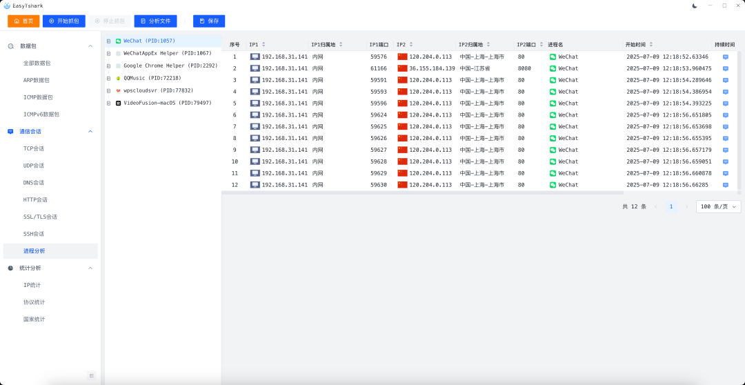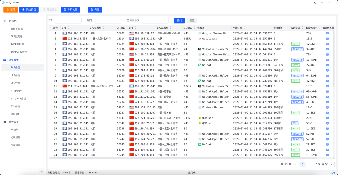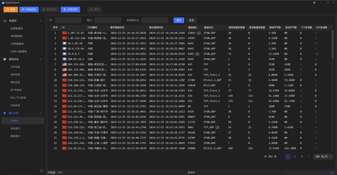 我们不难可以看出,在抓包界面,可以看到是内网IP还是外网IP。同时支持IP归属地和应用名称、协议等信息。方便我们抓取特定软件和协议的流量。