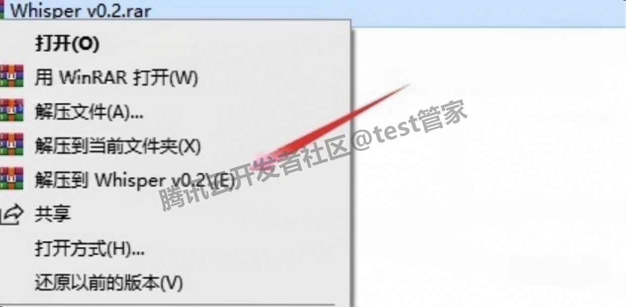 找到下载好的压缩包(比如 “whisper-v0.2 - 整合包.zip”),右键点击,选 “解压到当前文件夹”(推荐用 WinRAR 或 7-Zip,系统自带解压偶尔会丢失文件)