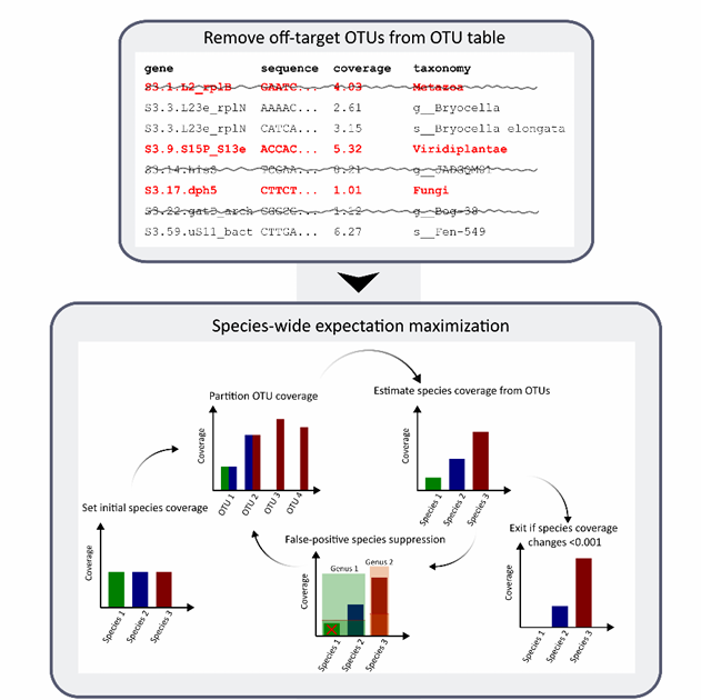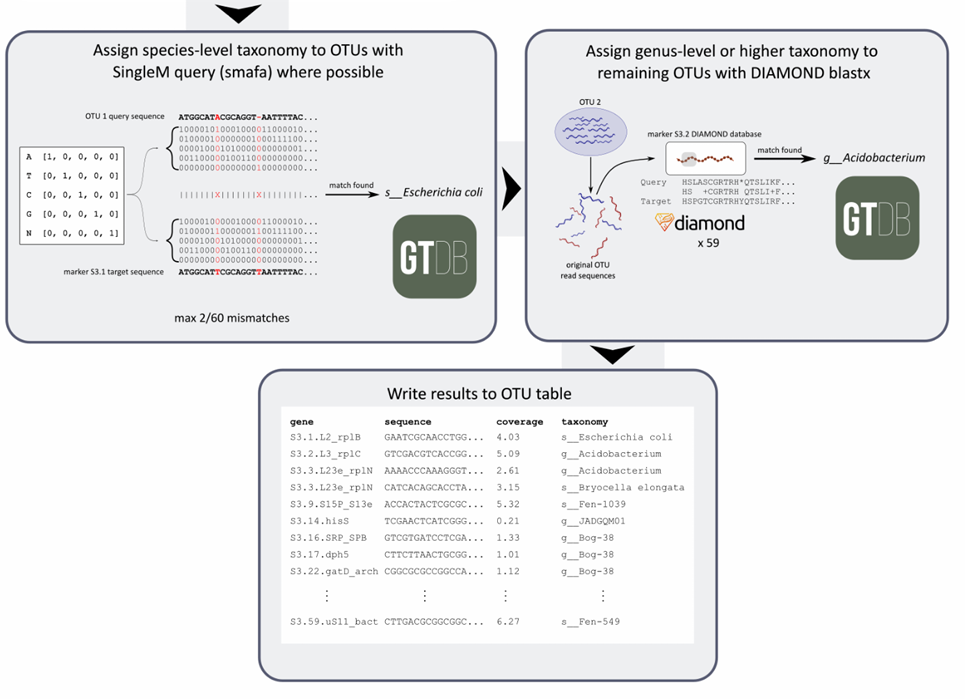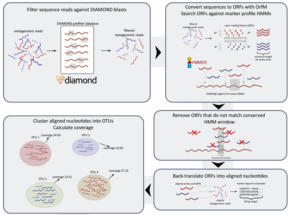 现有的许多宏基因组物种注释工具没有考虑未知的物种,昆士兰科技大学(QUT)生物医学科学学院微生物组研究中心,转化研究所开发的SingleM可以通过保守序列窗口策略解决此问题,但环境样本中仅8.0%的物种来自培养样本,表明基因组数据库仍需扩展。软件先对reads生成OTU,然后进行分类注释和丰度估算。下图是从原始宏基因组读取生成分类注释的OTU表的工作流程原理图。PS.也可以做16S 分析啦!