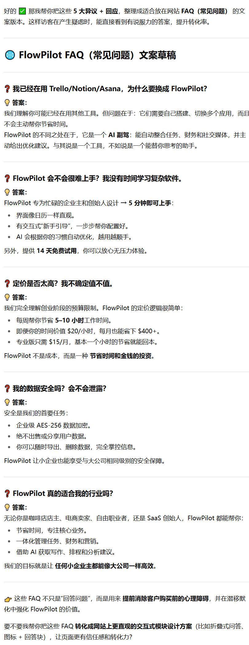 这些由AI生成的回复,可以直接添加到你网站的常见问题(FAQ)页面中,有效提升转化率。