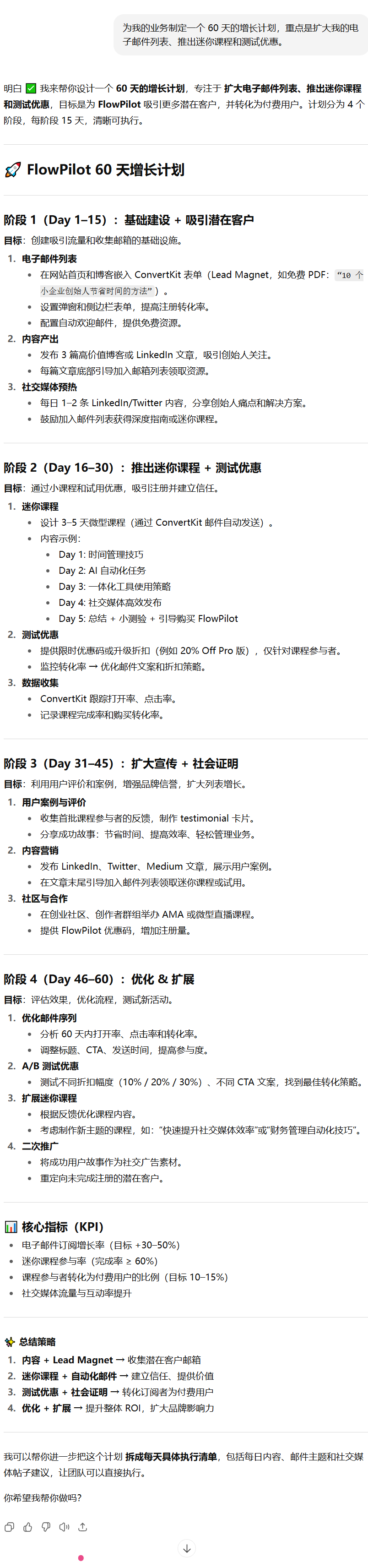 最后,如何将势头保持下去并实现稳步增长?让AI为你制定一个清晰的长期规划。