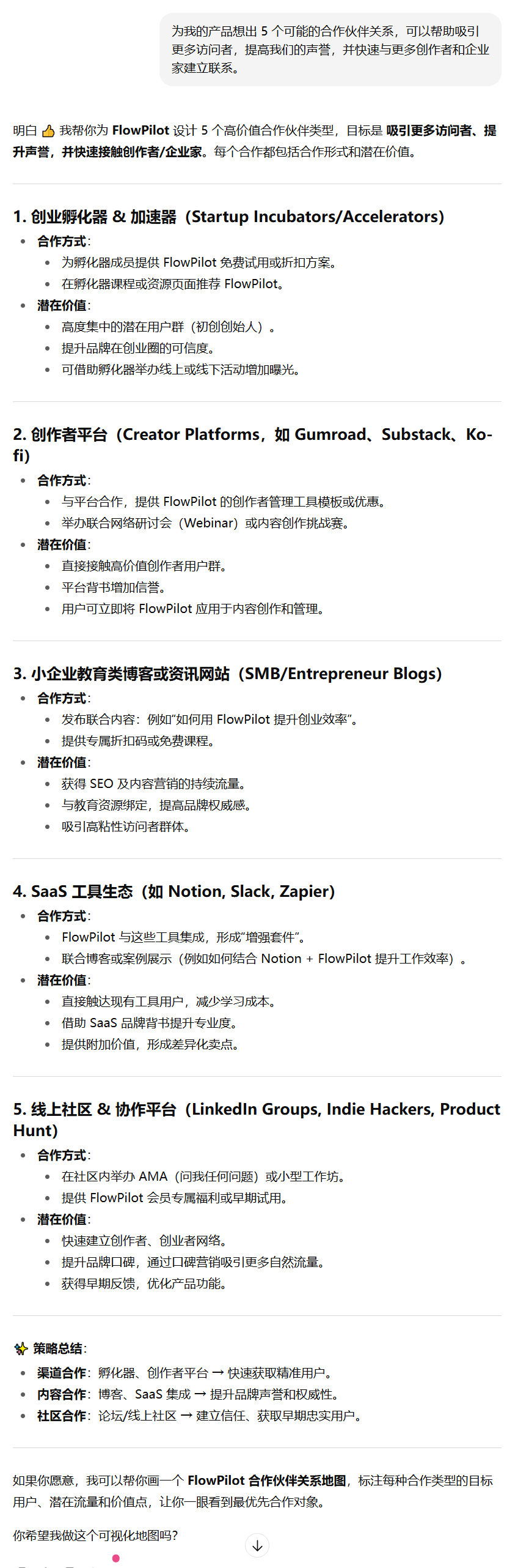 通过与相关领域的合作伙伴携手,可以迅速扩大影响力,吸引更多潜在用户。让AI成为你的“人脉专家”,为你牵线搭桥。