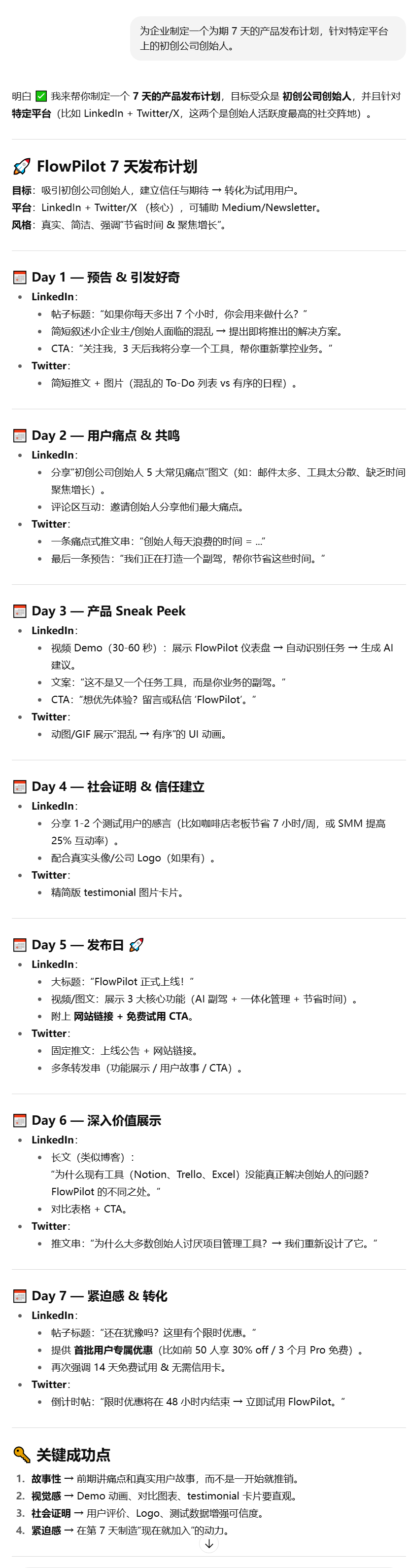 可以使用AI为企业制定一个为期 7 天的产品发布计划,针对特定平台上的初创公司创始人。