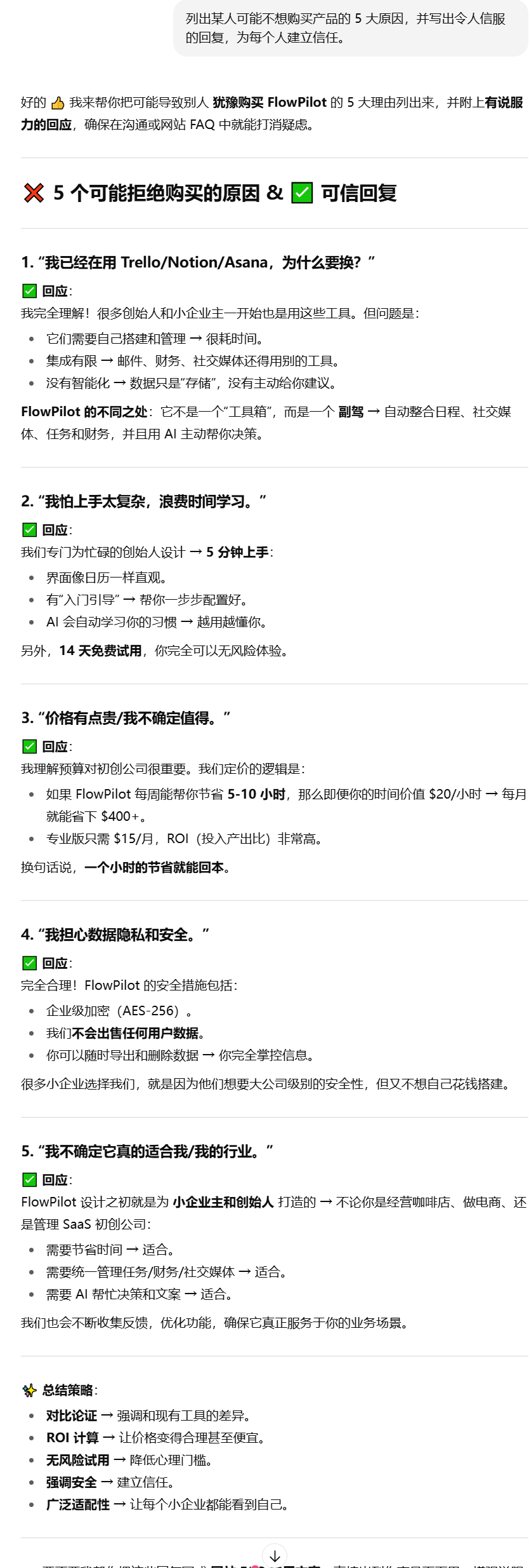 列出某人可能不想购买我的 [产品/服务] 的 5 大原因,并写出令人信服的回复,为每个人建立信任。