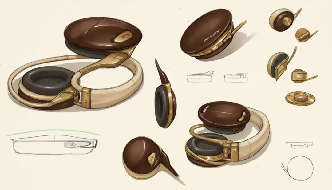 第一种风格变体:复古风格的耳机设计。参考经典耳机设计,使用复古色调和材质,如棕色、米色、复古金属色等。