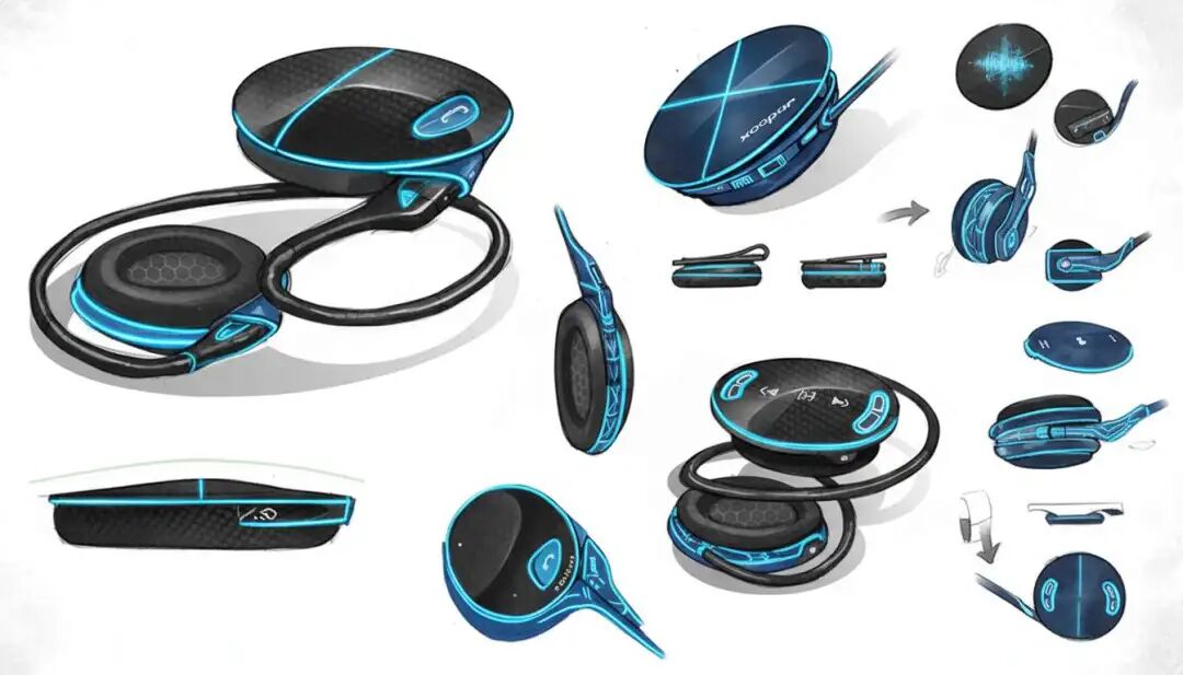 第二种风格变体:未来科技风格的耳机设计。更加前卫、科技感的设计,使用发光元素和未来感材质,如透明元素、发光边缘等。