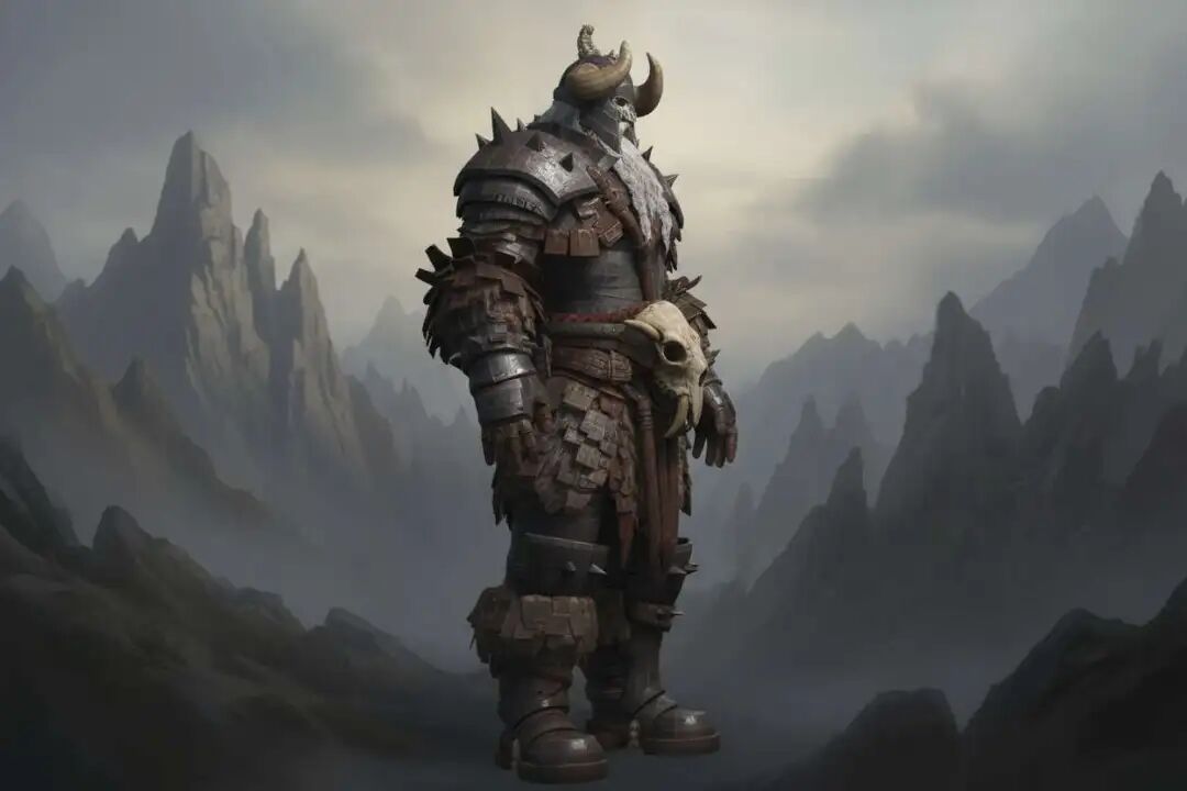 创建角色的前视图展示,展示角色的正面设计细节,包括带角头盔、尖刺重甲、动物头骨腰带扣和毛皮元素。