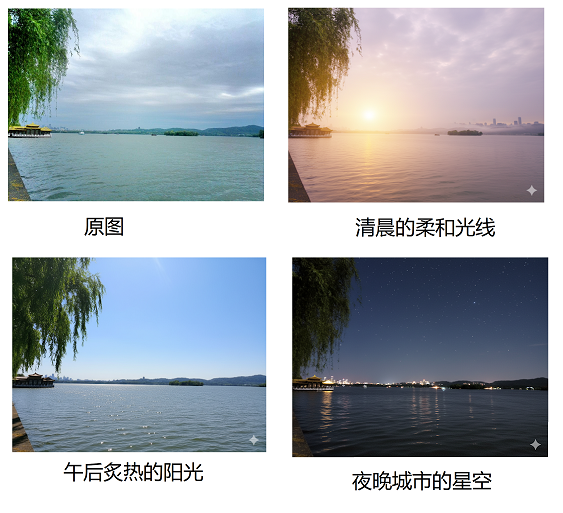 你可以像导演一样控制照片的光影。从清晨的柔和光线,到午后炙热的阳光,再到夜晚城市的霓虹,模型可以一键改变照片的灯光效果,营造出不同的氛围。