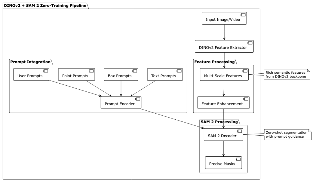 将 DINOv2 和 SAM 2 结合在一起的优势在于无需联合训练。DINOv2 提供强大的特征提取能力,SAM 2 负责精准分割,两者通过简单的接口调用即可协同工作。