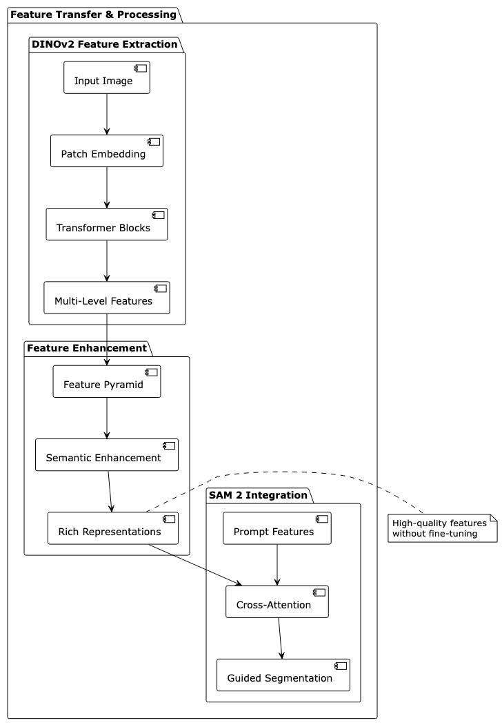 DINOv2 提取的丰富特征直接作为 SAM 2 的输入,为分割提供深层的语义信息: