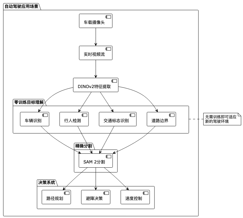 在自动驾驶领域,DINOv2 + SAM 2 的免训练特性让车辆能够快速适应新环境:
