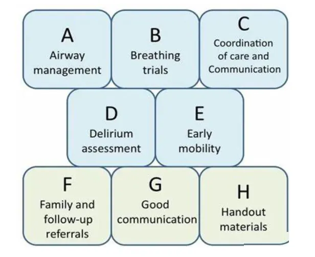 1.1. ABCDEFGH集束化:ABCDEFGH集束化是在2012年第二届PICS会议上提出的,是一种以护士为主导、以患者为中心的综合性跨专业管理策略,旨在优化患者康复。它包括以下组成部分:A:疼痛的评估、预防和管理。B:自发觉醒试验和自主呼吸试验。C:镇静和镇痛的选择。D:谵妄评估、预防和管理。E:早期活动能力。F:家庭参与、随访转介和功能协调。G:交接通信。H:PICS 和 PICS-F 上的任务材料。一项回顾性研究表明,该策略通过优化疼痛管理、避免深度镇静、降低谵妄发生率、缩短机械通气持续时间以及促进危重患者及其家属的参与来降低 PICS 的风险。此外,Pun 等人对 1500 多名 ICU 成年患者进行了一项前瞻性研究,结果表明,在治疗早期采用基于 ABCDEF 集束治疗的干预措施可以提高危重患者的生存率,并进一步降低 ICU 后并发症的风险,例如 PICS 和再入院。