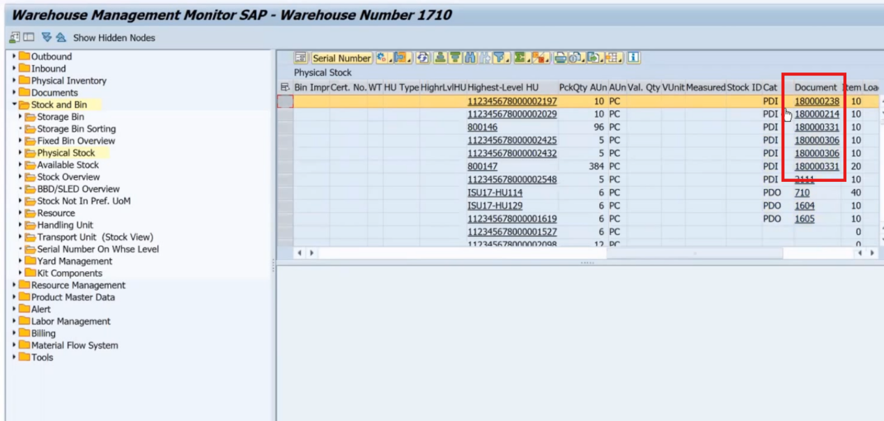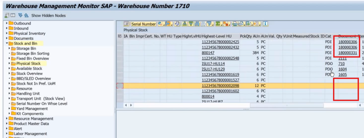 而存储类型Y011是一个仓库主存储区域,库存数量看不到inbound delivery号码等信息了,如下图示: